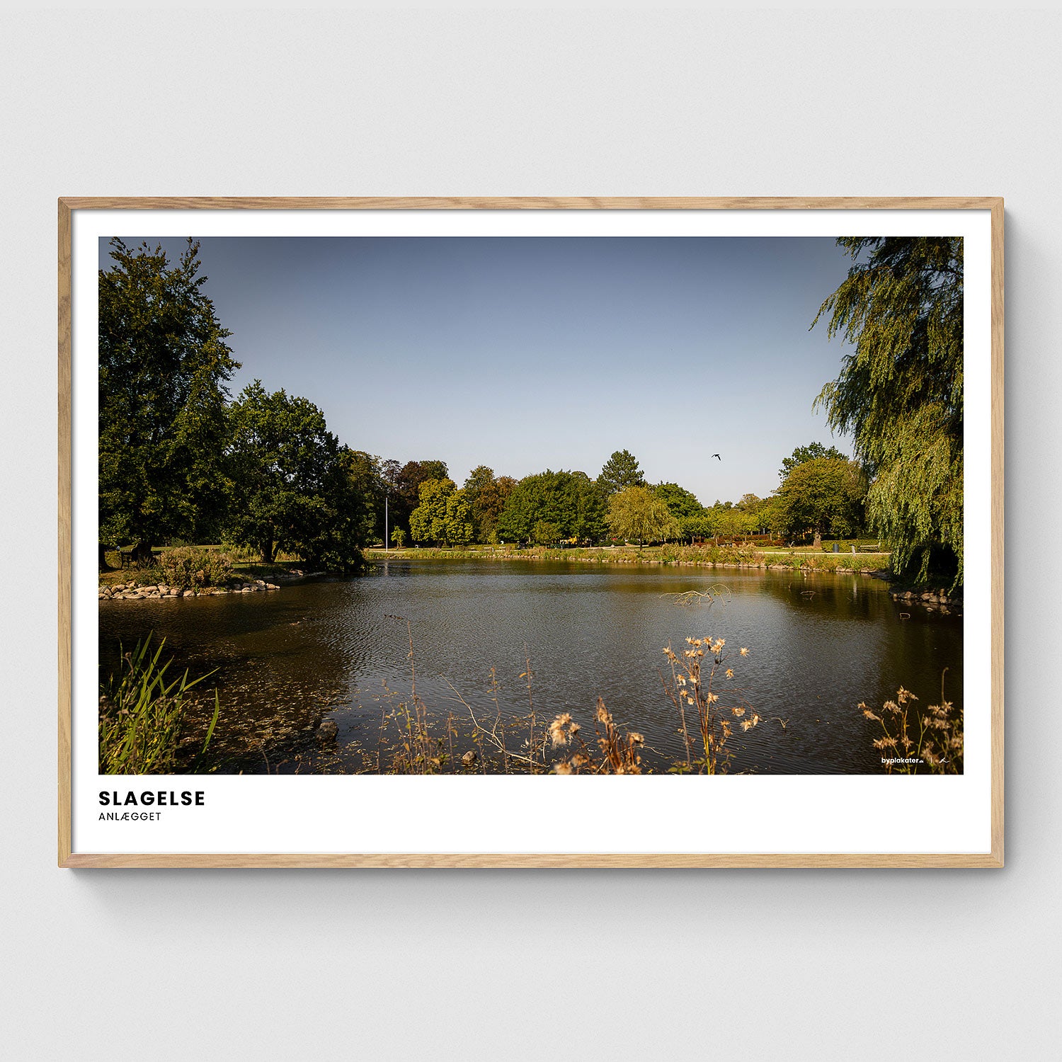 Parken i Slagelse, også kaldet "Anlægget", beskrives af mange som en helt særlig oase i byen - og med god grund. Plakaten her fokuserer på hele områdets smukke natur og den flotte sø.
