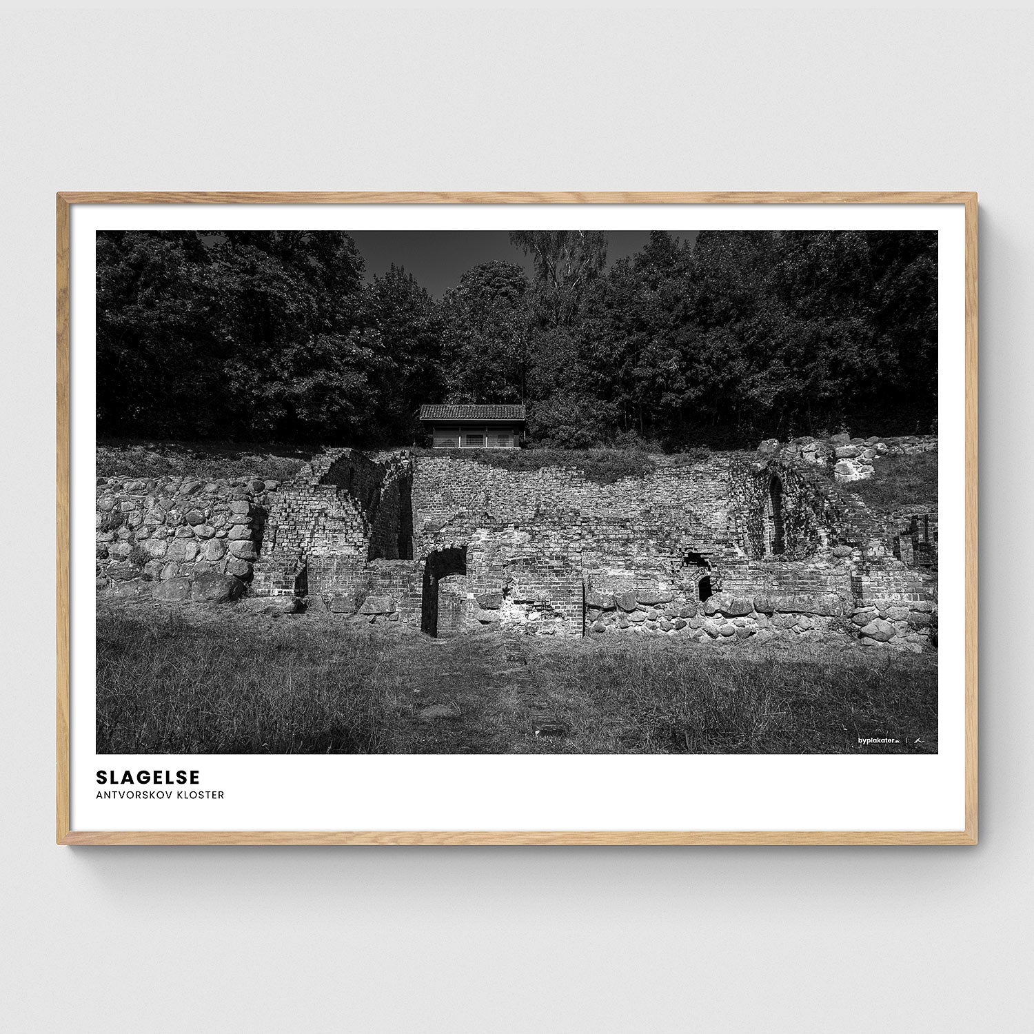 Ruinen efter Antvorskov Kloster i Slagelse er en oplevelse, som man ikke må snyde sig selv for, hvis man besøger byen. Plakaten her har med sit sort/hvide udtryk fokus på historien og det visuelle blikfang.