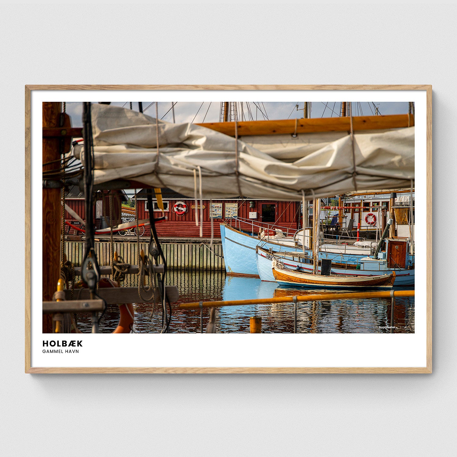 Et billede med stort fokus på lokal genkendelighed i Holbæk, med både havnemiljøet, de gamle både og de røde gavle.