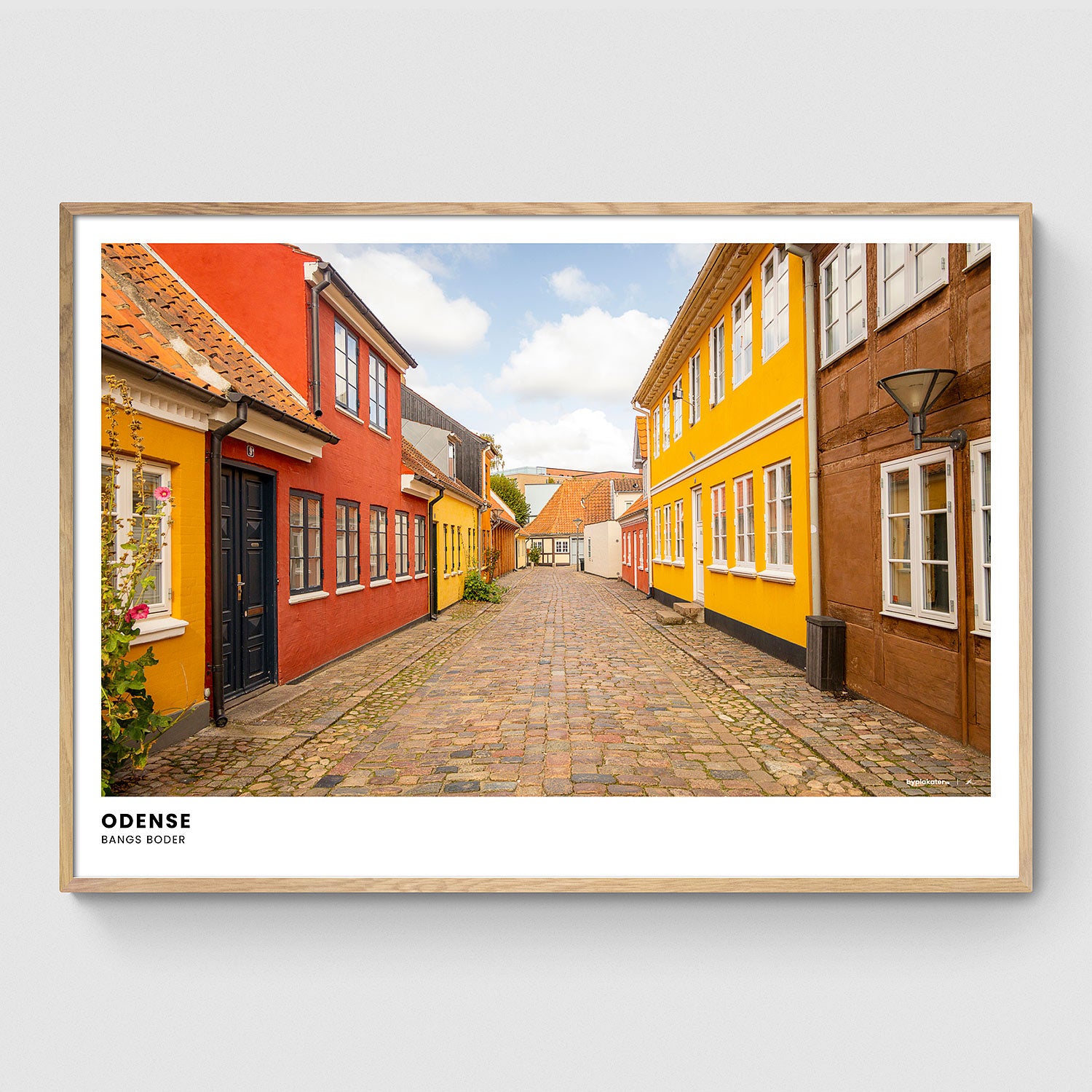 En plakat fra Bangs Boder, hvor de farverige huse står som levende vidnesbyrd om byens historiske rødder. Motivet fremhæver den charmerende gade og dens særlige atmosfære, som forbinder fortidens håndværkstraditioner med nutidens byliv.