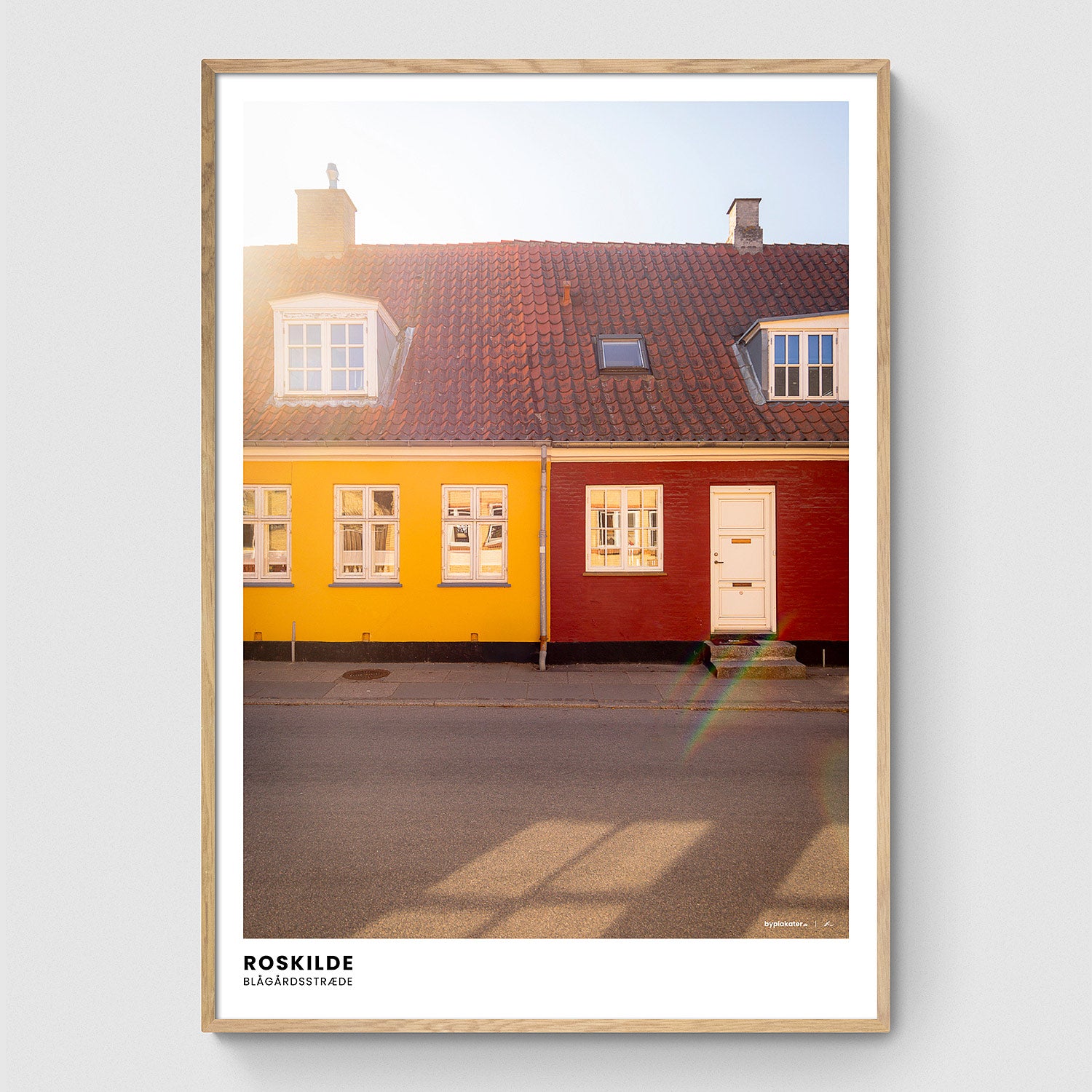 Farverige facader og hyggelig gadeidyl præger denne plakat af Blågårdsstræde i Roskilde. De smukt malede huse skaber et levende og charmerende udtryk, hvor historie og moderne byliv smelter sammen i en unik atmosfære.