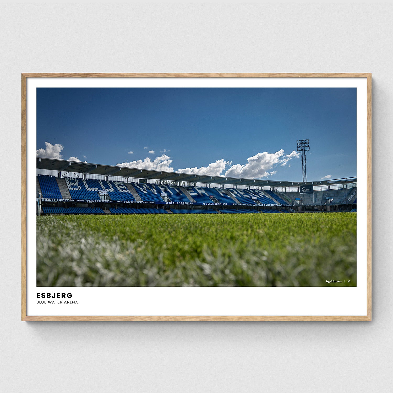 Indfang følelsen af fodbold, fællesskab og vestjysk stolthed med denne plakat taget indefra Esbjergs ikoniske stadion, Blue Water Arena. På en solrig dag stråler tribunerne, og den store, genkendelige tekst Blue Water Arena står i centrum – et moderne vartegn for byens sportslige og kulturelle liv.