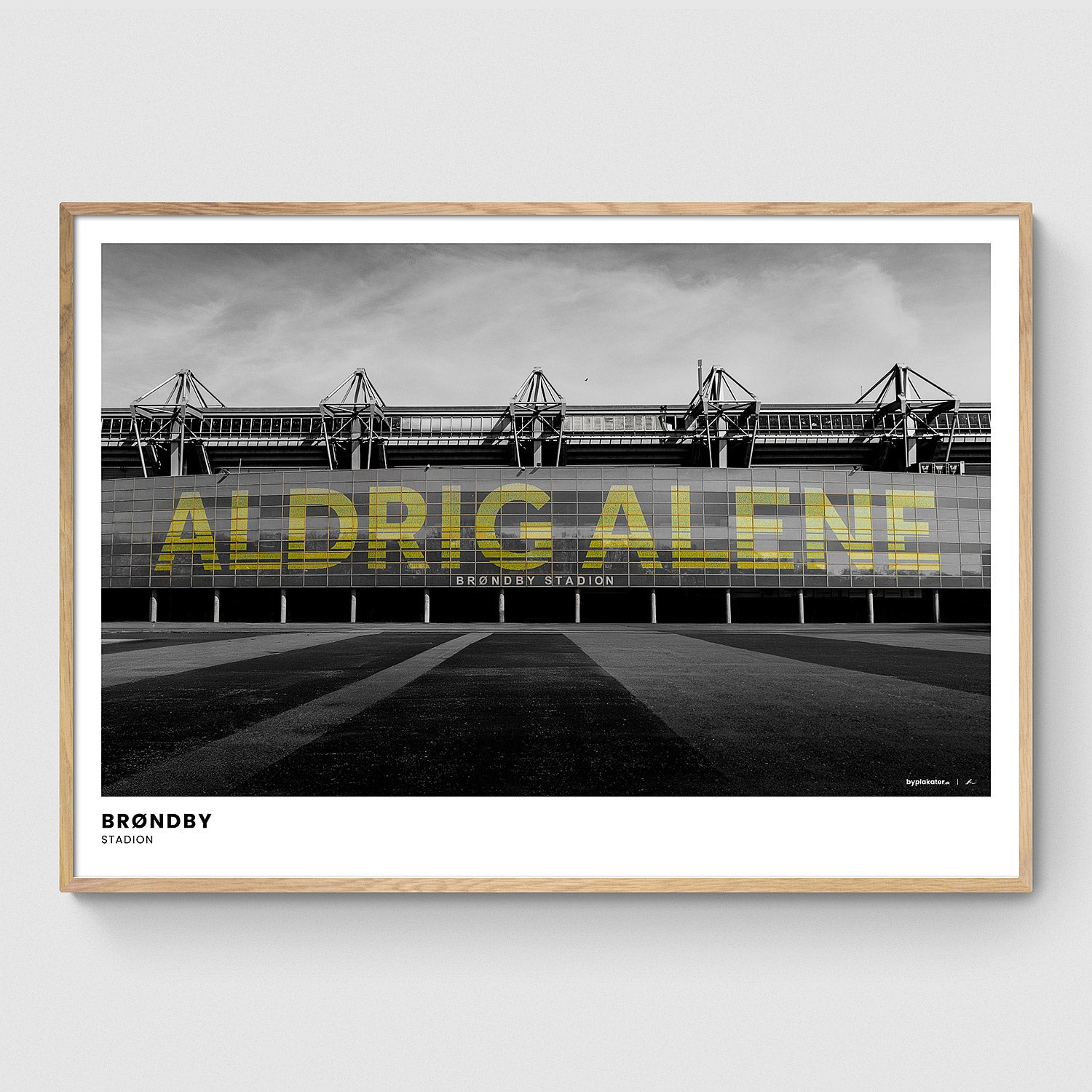 Denne plakat er en visuel hyldest til Brøndby Stadion – Vestegnens ikon og centrum for klubbens dedikerede fanmiljø. Ordene “Aldrig Alene” står markant frem på facaden og understreger det stærke bånd mellem holdet og dem på tribunerne.