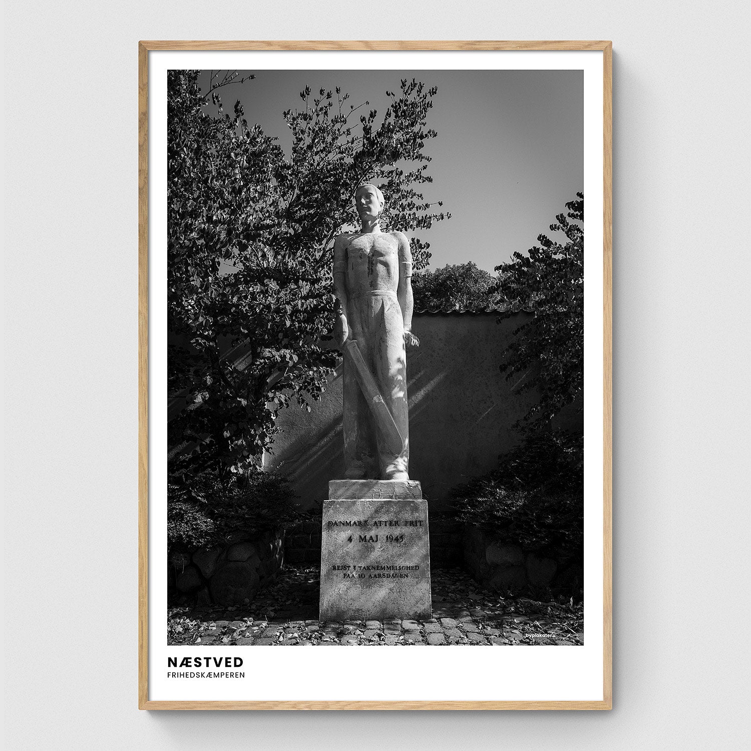 Frihedskæmperen er en af mange skulpturer, som man finder rundt omkring i Næstved. Plakaten her byder på et stilrent sort/hvid look af byens minde om Danmarks befrielse.