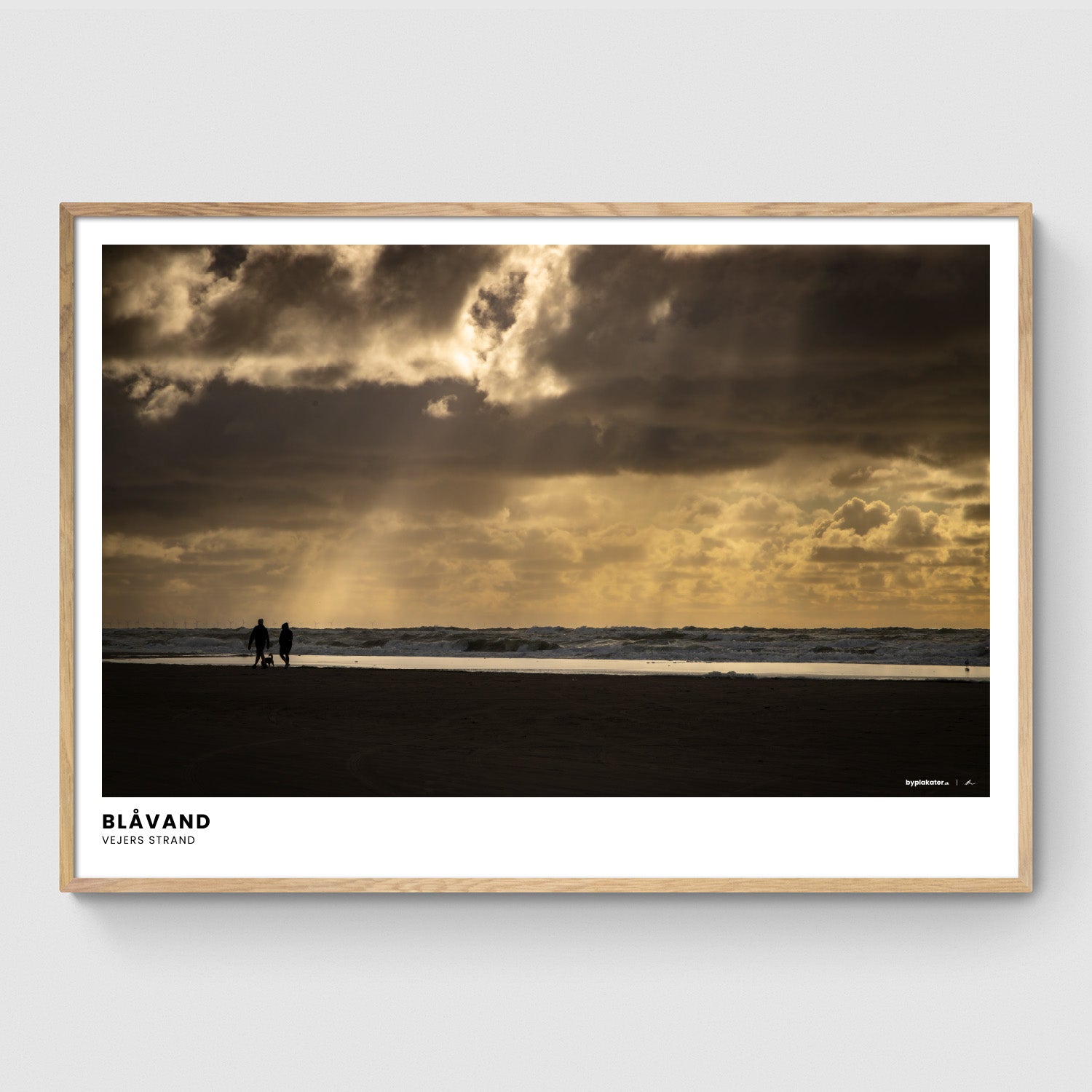 Et stemningsfuldt motiv af et par, der hånd i hånd går langs strandkanten ved Vejers Strand, mens deres hund trofast følger med. Solnedgangen maler himlen i gyldne nuancer, henover de dramatiske skyer. En plakat, der fanger roen, nærværet og den ubekymrede glæde ved en sommeraften ved havet.