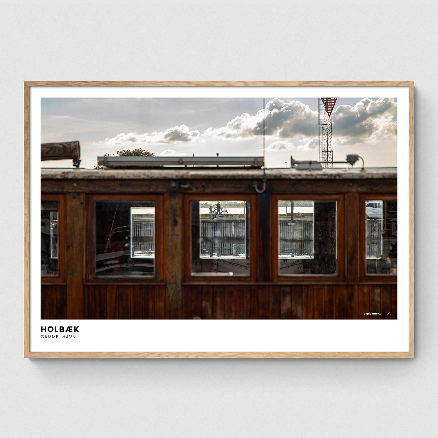 Et motiv som emmer af stemningen i Holbæk, centreret omkring Holbæk Gammel Havn, med et billede taget gennem et af de mange ikoniske gamle træskibe, som man finder på havnen.