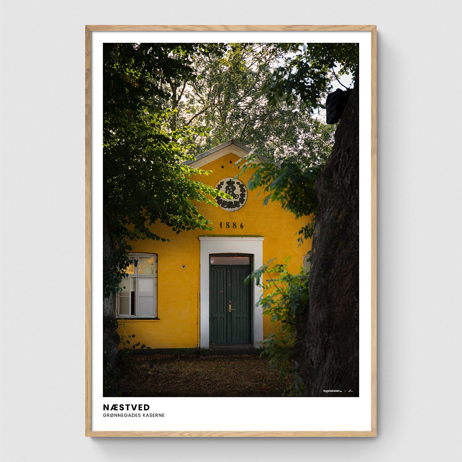 De gule bygninger på Grønnegades Kaserne er meget karakteristiske - her er en af dem fotograferet gennem træerne på en solrig sommerdag.