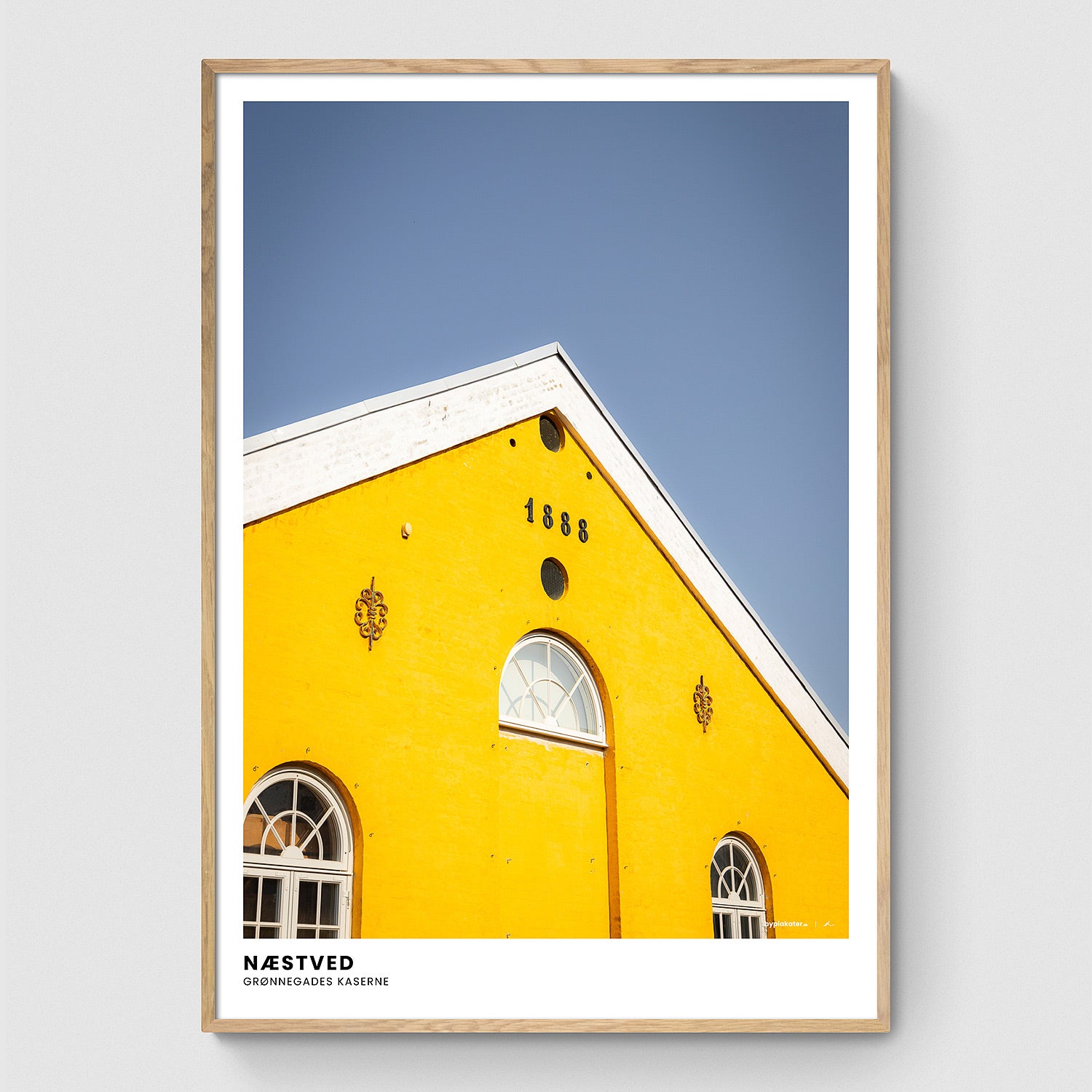 En stilren plakat med en af de historiske gule bygninger, som man finder på Grønnegades Kaserne. Et unikt motiv med lokal genkendelighed.