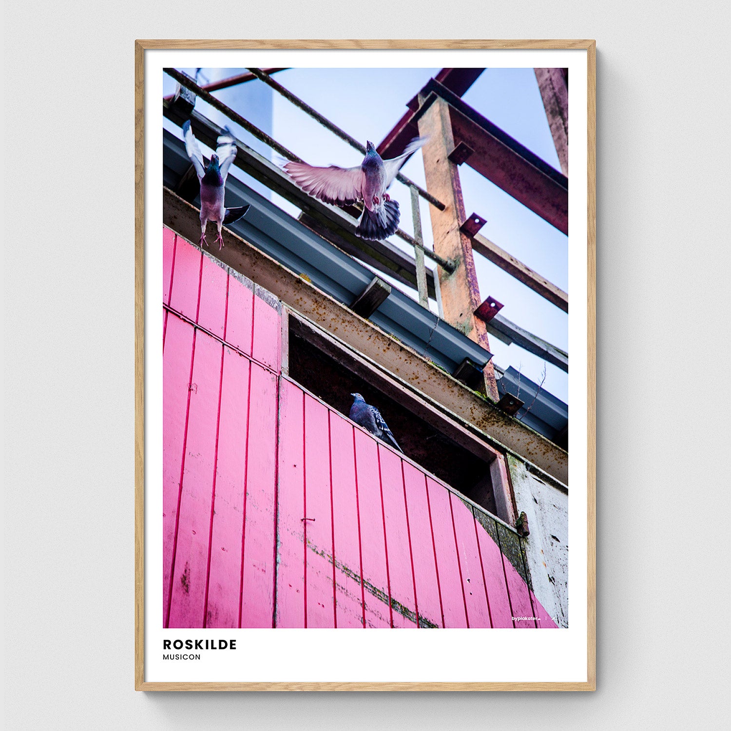 Et par duer fotograferet på toppen af porten til skateparken Hal 12 i Roskilde. Den ene lettede netop som billedet blev taget, hvilket giver liv og spræl til et billede, som samtidig har et lidt råt og urbant udtryk.