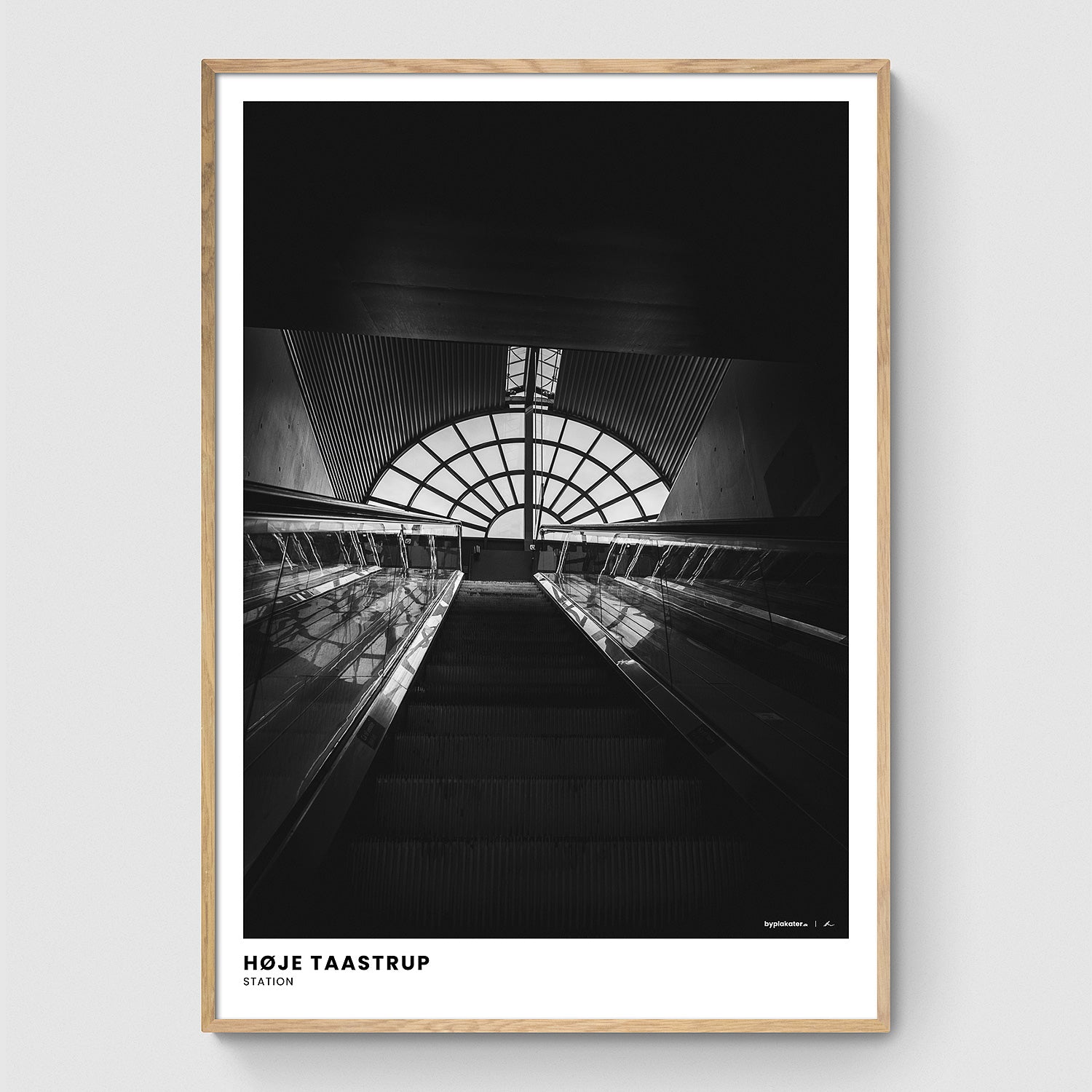 Rulletrappen løfter blikket mod de høje glasflader. Beton, stål og refleksioner i en rå komposition af linjer og lys. Plakaten her hylder de flotte rene linjer som man finder, i Høje Taastrups flotte stationsbygning.
