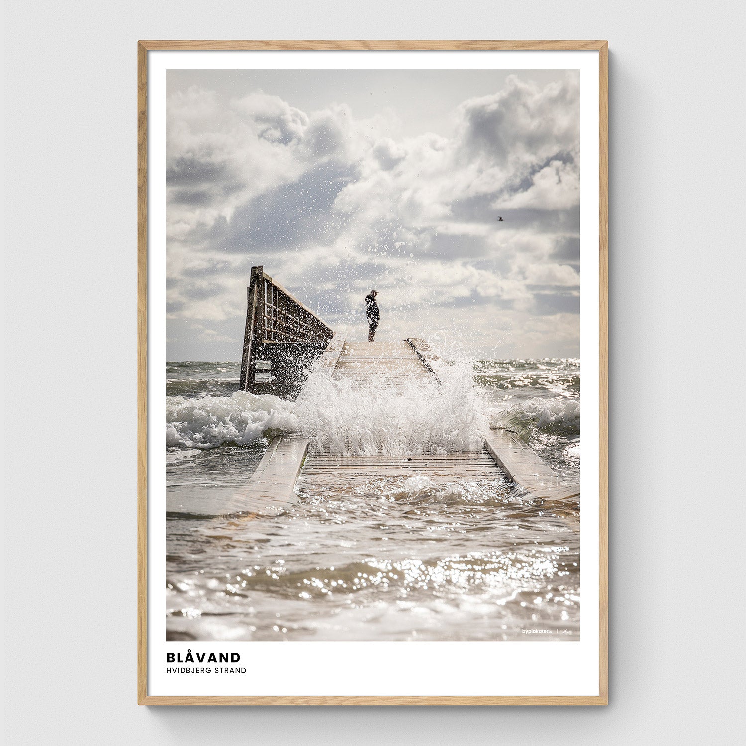 I Blåvand finder man Hvidbjerg Strand som fører op til Blåvand Fyr. Denne plakat viser bølgerne ramme strandens badebro og bringer en stemning af Vesterhavet ind i hjemmet.