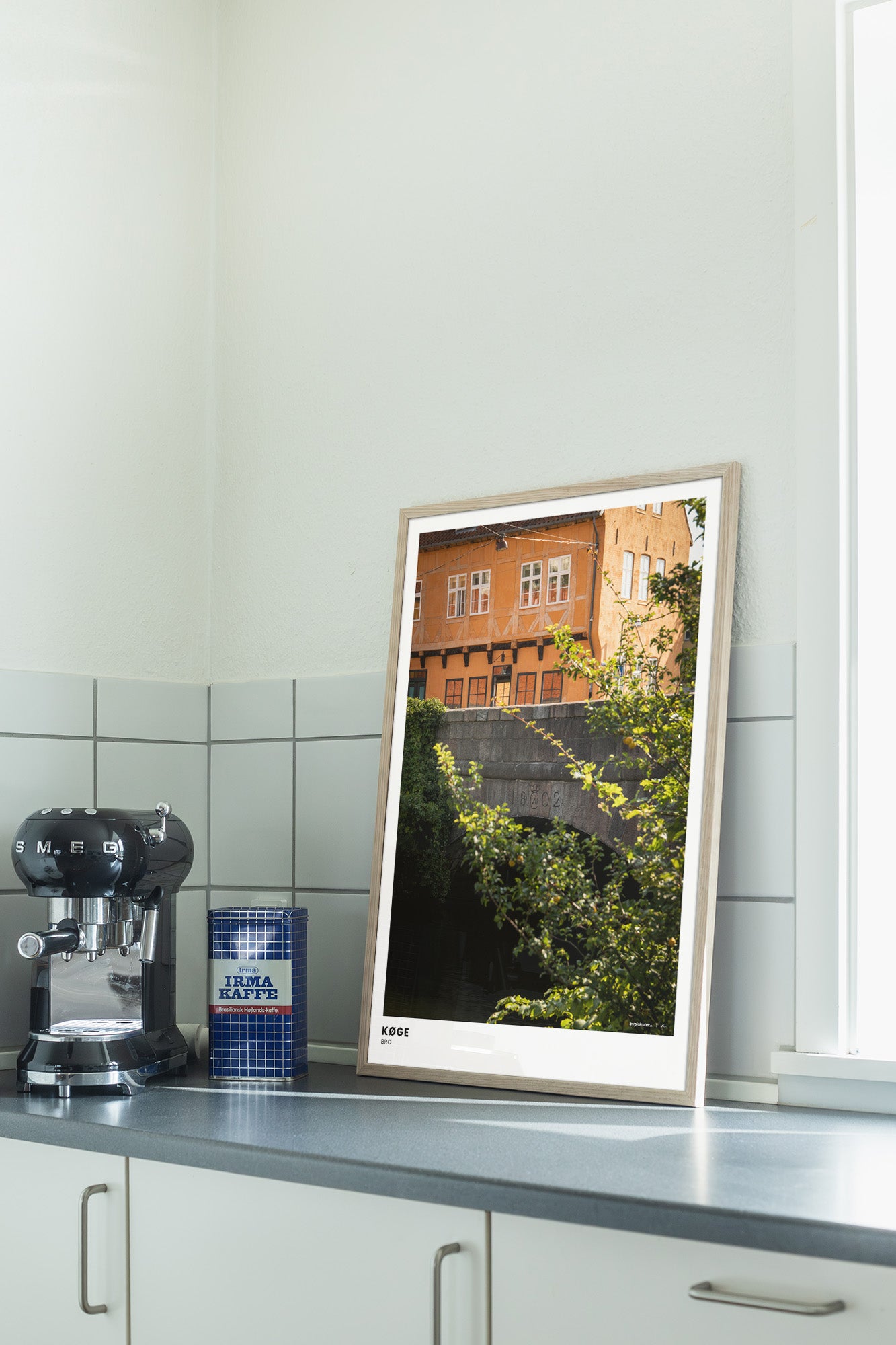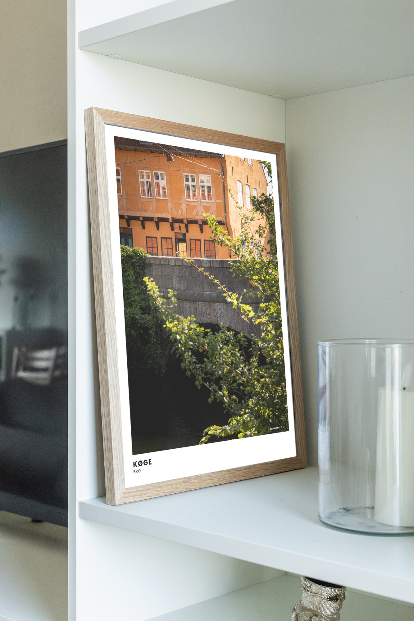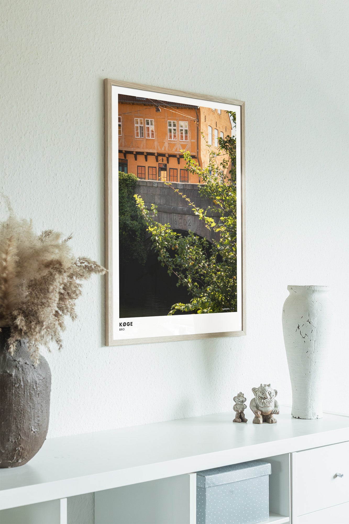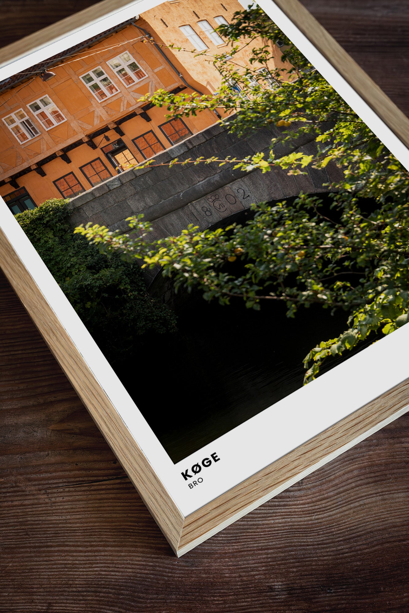 Vores rammer er håndlavede i egetræ på vores lokale trykkeri, og findes i farverne lys, mørk og sort. Alle størrelser indrammes med rigtigt glas, bortset fra 70x100 cm, som indrammes med en høj kvalitet af plexiglas. Se vores rammer.