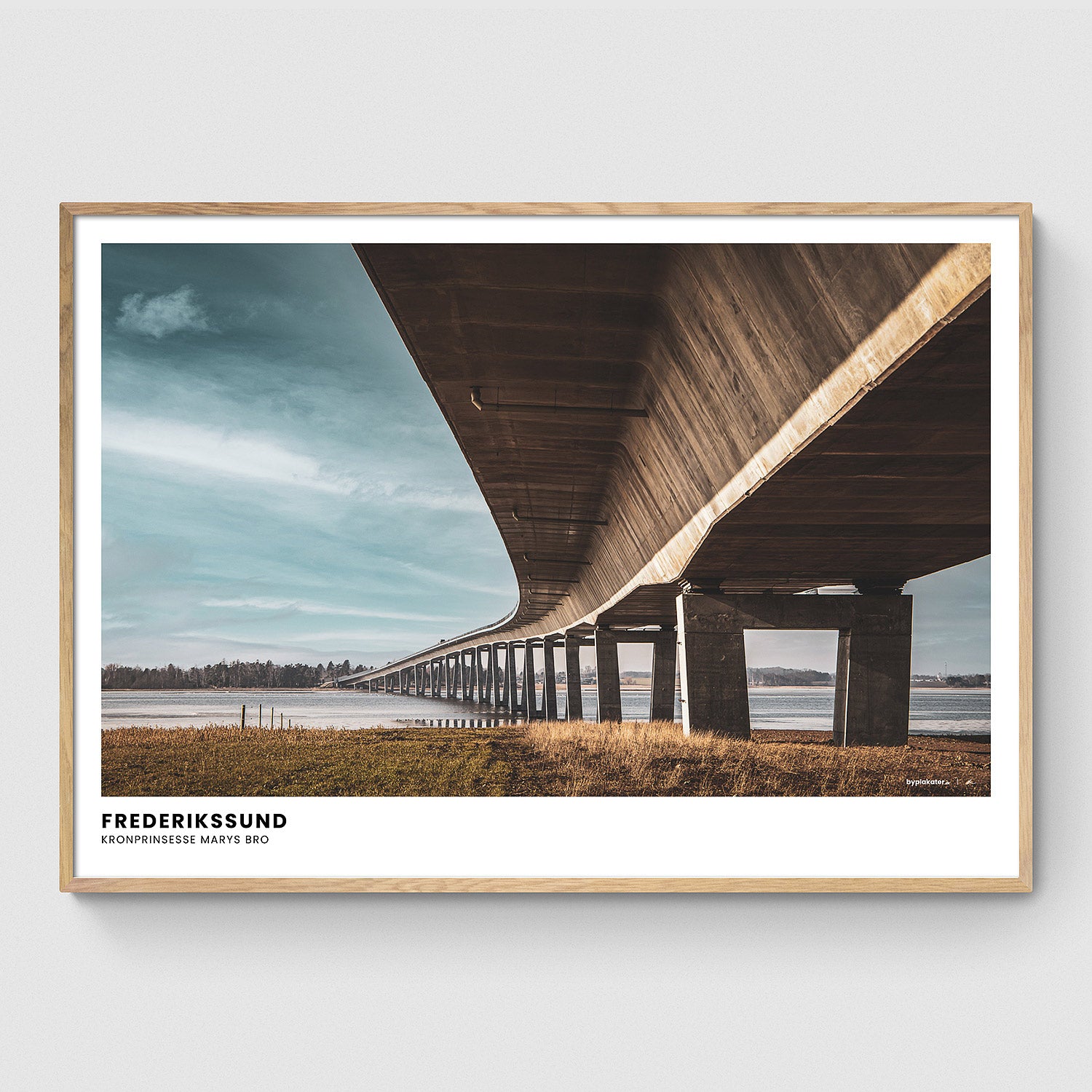 Kronprinsesse Marys Bro strækker sig over Roskilde Fjord lidt syd for Frederikssund. Broen er relativt ny og åbnede allerede i 2019. Billedet her er redigeret i et mat udtryk med jordnære farver, hvor broens imposante vinkel står frem.