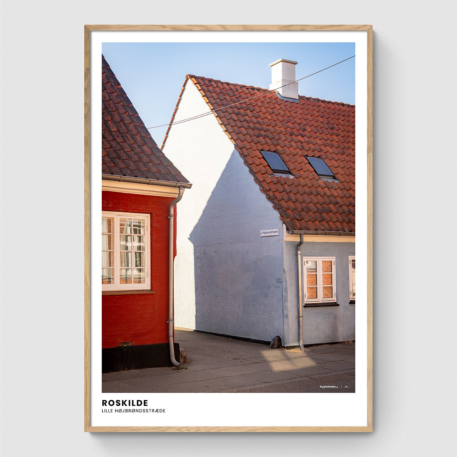 Tag et kig ind i Roskildes skjulte perler med denne stemningsfulde plakat af Lille Højbrøndsstræde. En smal, hyggelig gade, hvor farverige facader og gamle døre vidner om byens rige historie og levende byliv.