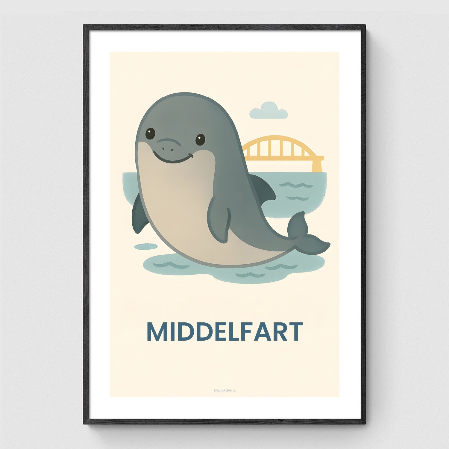 Marsvinet (den lille tandhval) er et vigtigt symbol for Middelfart og Lillebælt. Her kan man spotte dem i det fri, og byen har specialiseret sig i havpattedyr. Plakaten med det glade marsvin er en sød hyldest til Danmarks mindste hval.