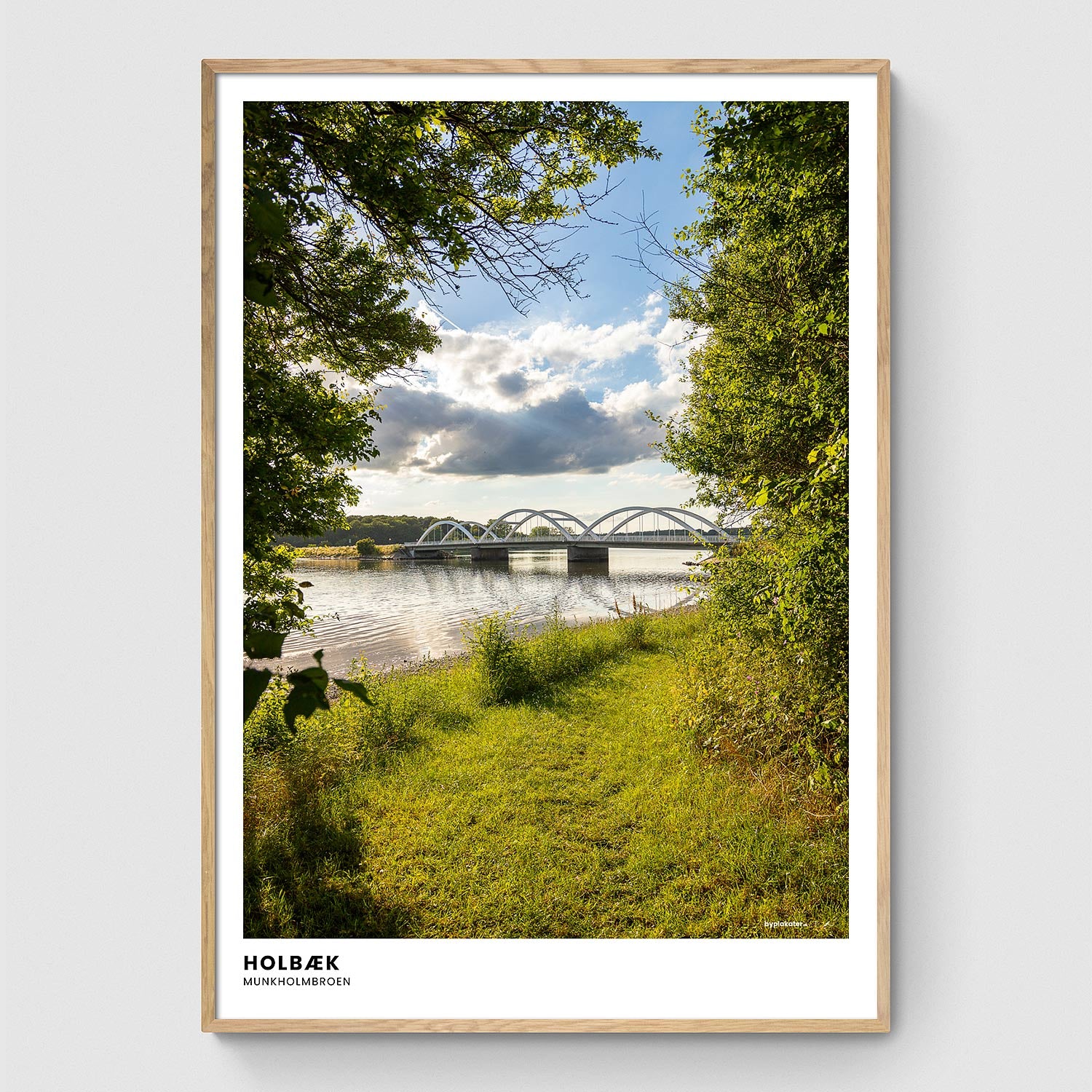 Tæt på Holbæk finder man Munkholmbroen, som her er fotograferet gennem træerne, som man finder nede ved vandet, hvor der i øvrigt også ligger charmerende små både.