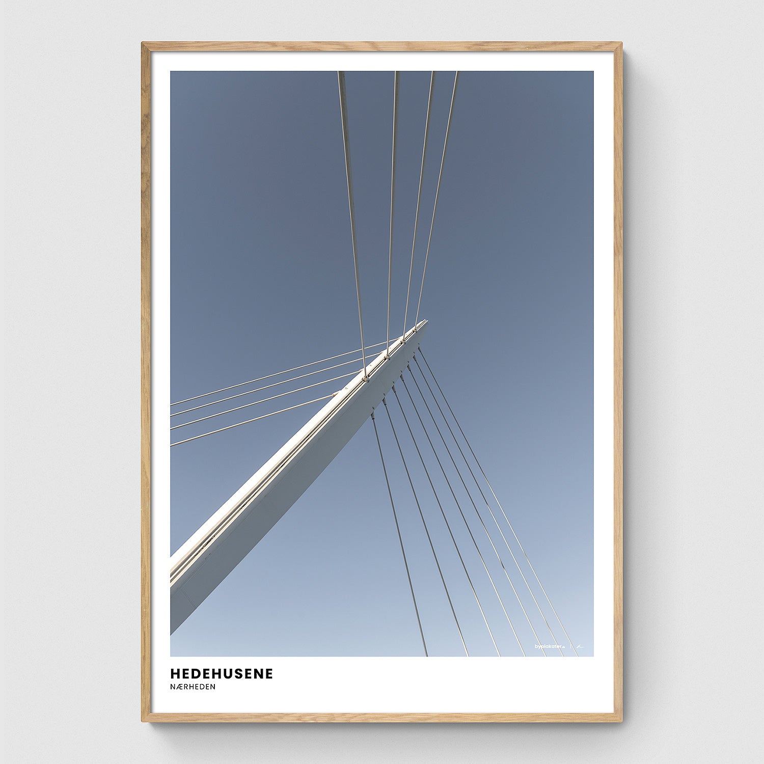 En enkel og stilren billede af den flotte bro, som forbinder Hedehusene med den nye bydel Nærheden. En nordisk plakat som hylder lokal arkitektur.