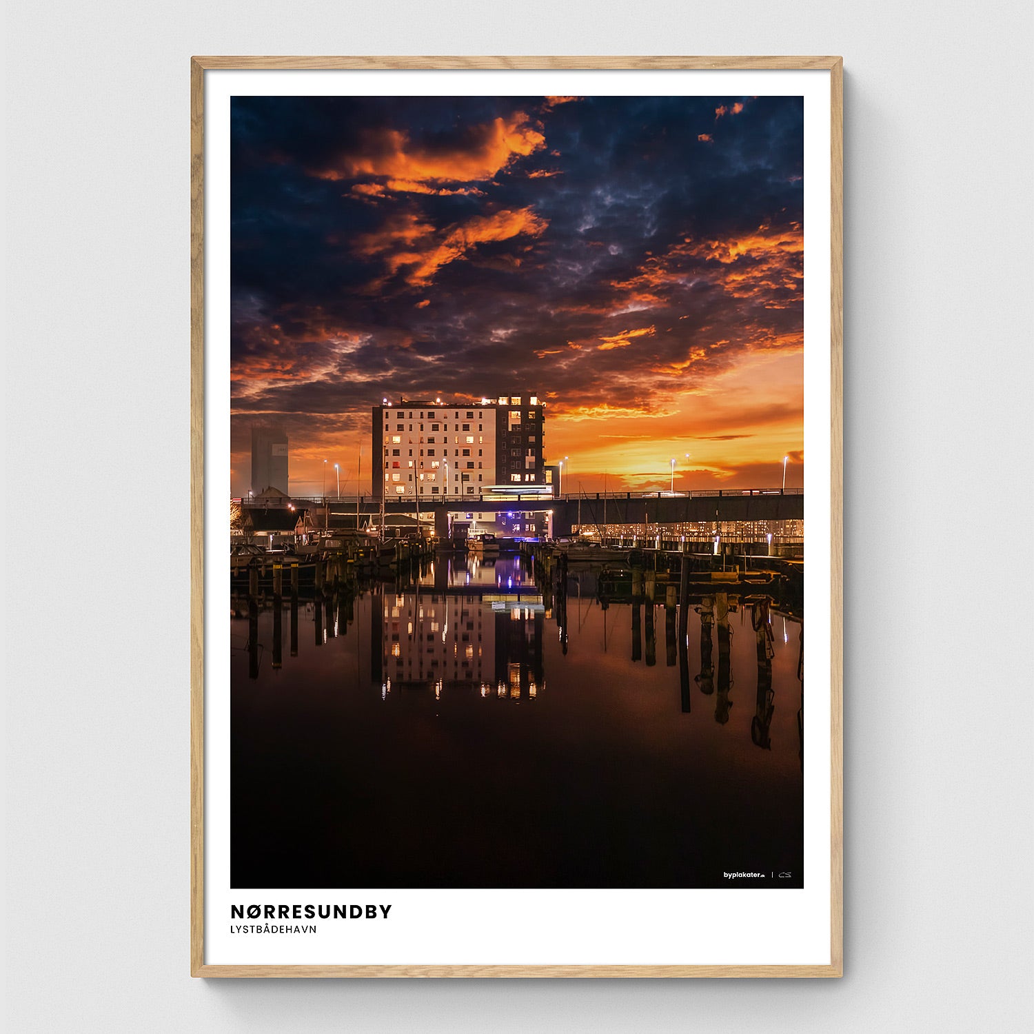 Aftenen sænker sig over Lystbådehavnen i Nørresundby, hvor skyerne danser dramatisk over det stille vand og spejler naturens kraft.