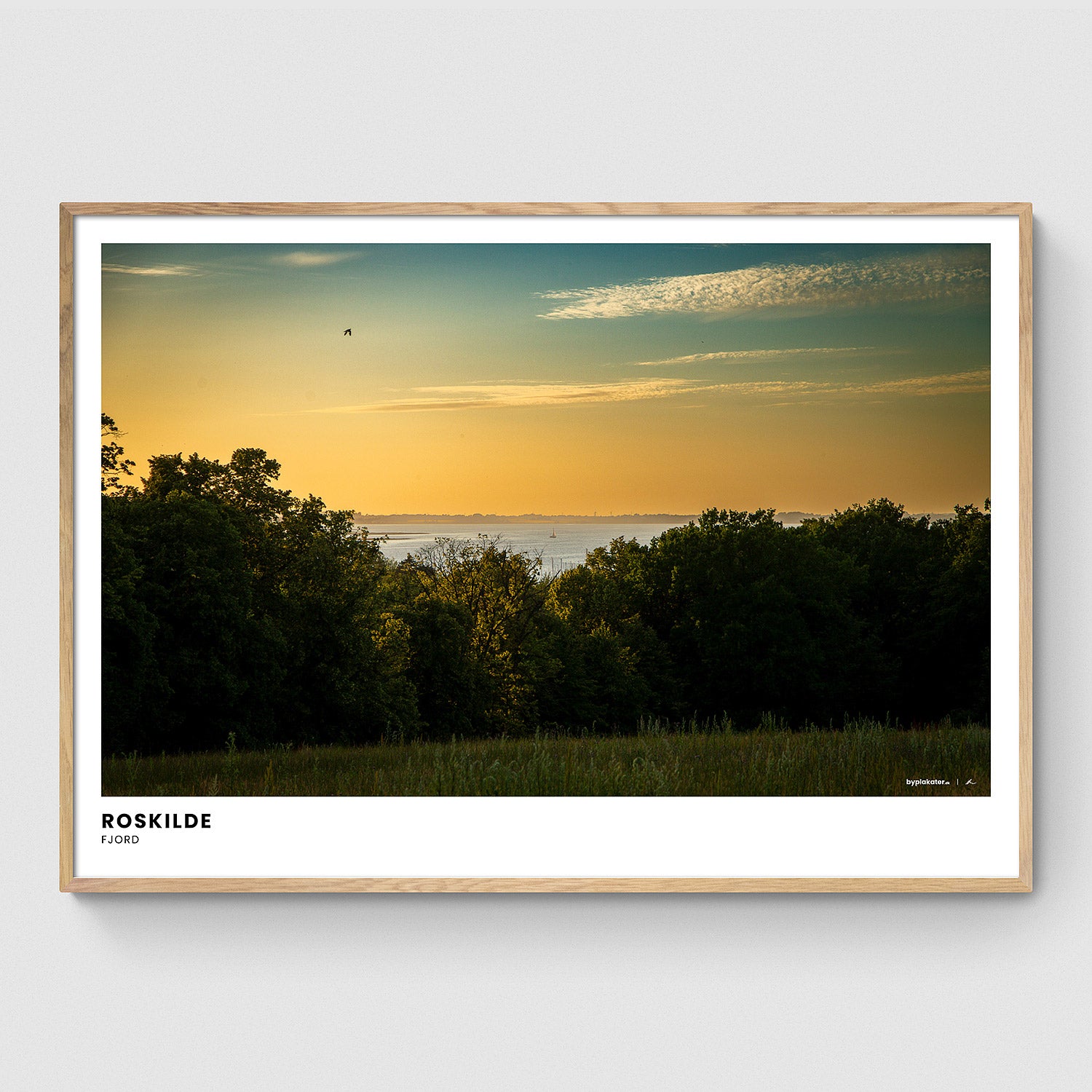 Bagved Roskilde Domkirke finder man Provstestræde og et skønt naturområde. Dette billede er taget netop herfra, ud over markerne med Roskilde Fjord i baggrunden og solen, som langsomt er på vej ned.