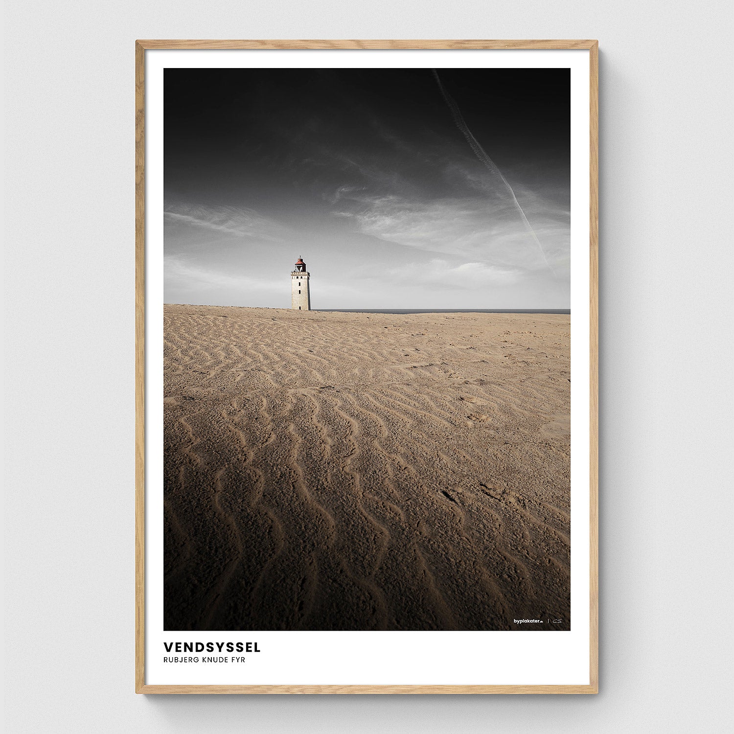 Rubjerg Knude Fyr er et af de mest imponerende fyrtårne langs den jyske kyst, og denne plakat fanger både fyrtårnet og de dramatiske sandklitter, der omgiver det. De varme farver i sandet og de grålige toner fra fyret skaber en visuel kontrast, der gør motivet både levende og tidløst. En plakat, der ikke kun er et smukt kunstværk, men også et symbol på den dynamik og forandring, der præger vores kystlinje.
