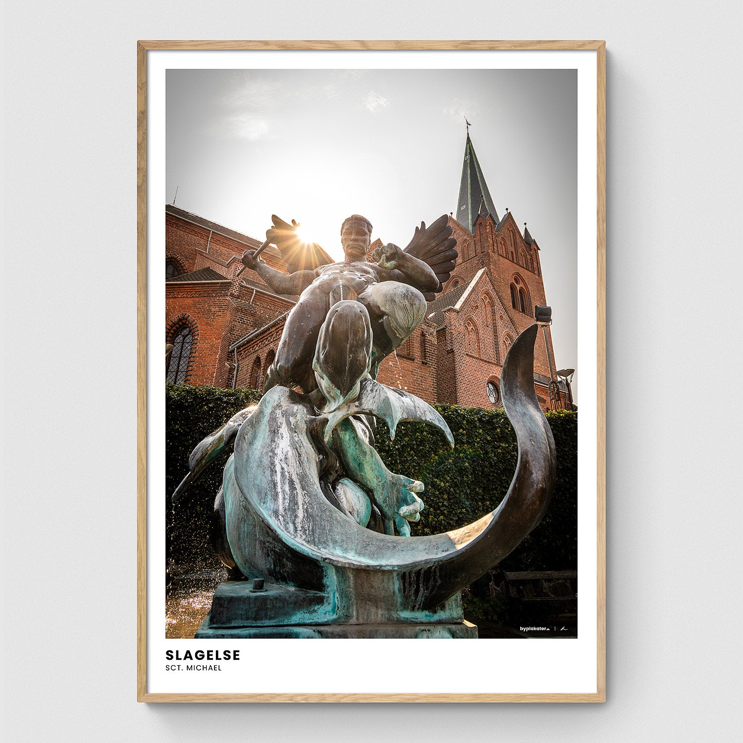 Sct. Michael er Slagelses stolte skytshelgen. Også kaldet dragedræberen, ses Sct. Michael med sit sværd i kampen mod det onde. Her er skulpturen fotograferet foran Sct. Mikkels Kirke.