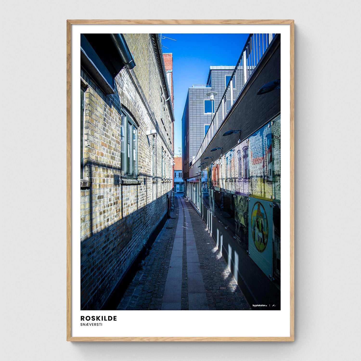 Vores rammer er håndlavede i egetræ på vores lokale trykkeri, og findes i farverne lys, mørk og sort. Alle størrelser indrammes med rigtigt glas, bortset fra 70x100 cm, som indrammes med en høj kvalitet af plexiglas. Se vores rammer.