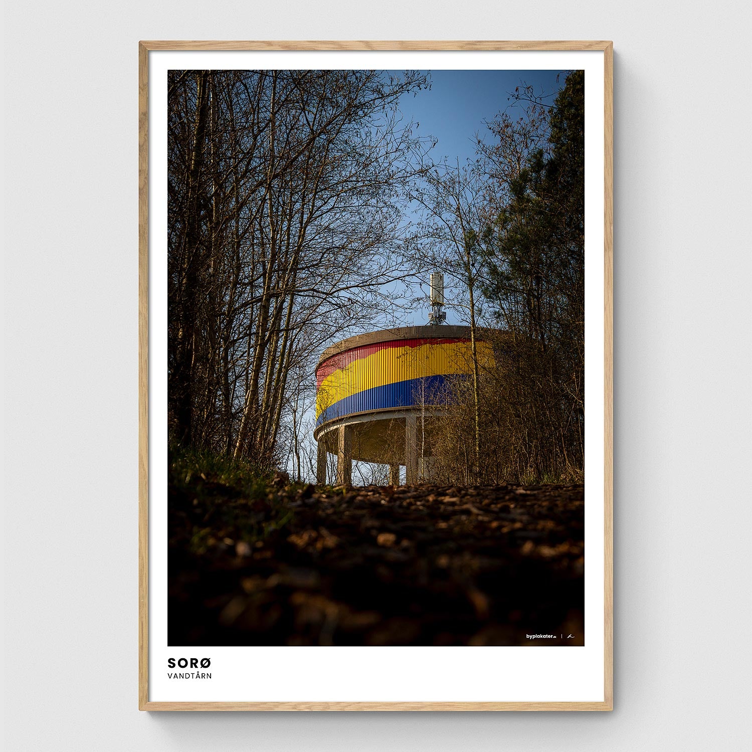 Sorøs ikoniske vandtårn står stolt omgivet af grønne træer og blå himmel. Med sin karakteristiske arkitektur er tårnet et markant vartegn, der pryder bybilledet og nu også din væg som en stilfuld og tidløs plakat.