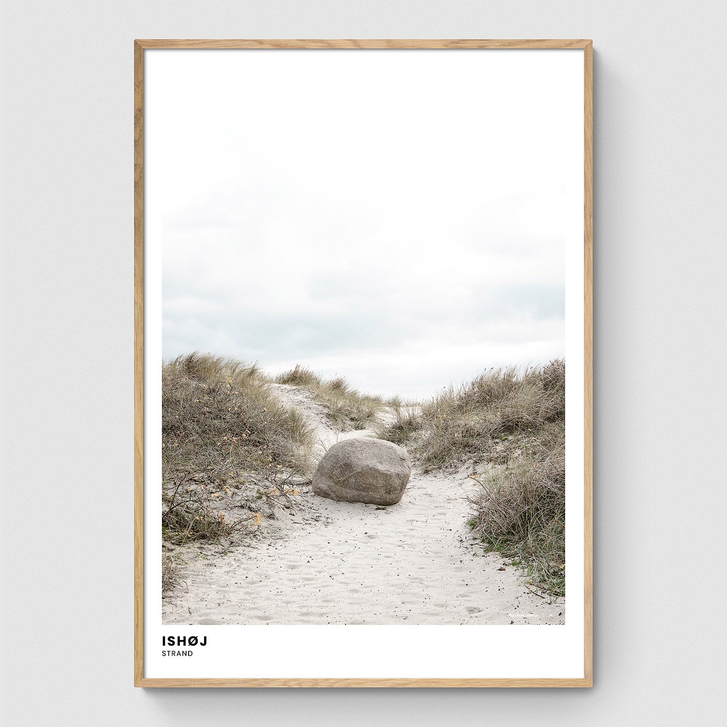 En sti ned til stranden. Billedet her er taget en råkold dag, hvor blæsten virkelig havde godt fat. En plakat med nordisk stil og simple sandfarver.