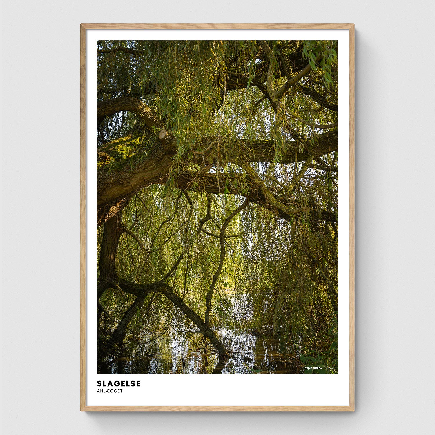 Anlægget i Slagelse har 2 søer og på en fototur i området var dette træ nærmest faldet i vandet. Det skabte et fantastisk motiv - især da solen var højt på himlen, hvilket gav nogle charmerende skygger. Denne plakat byder på skøn naturstemning.