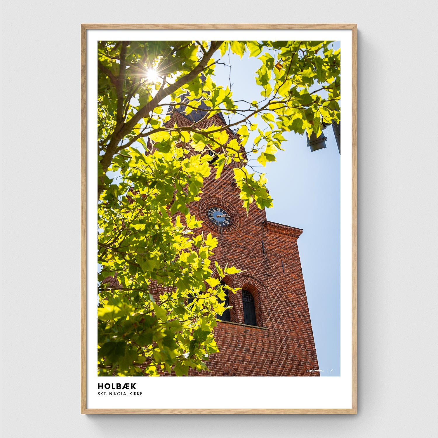 Smuk og solrig plakat med uret i den historiske Skt. Nikolai Kirke i Holbæk, som blev opført helt tilbage i 1868-72. Billedet er taget gennem et af de omkringliggende træer, for at skabe dybde og farver i motivet.