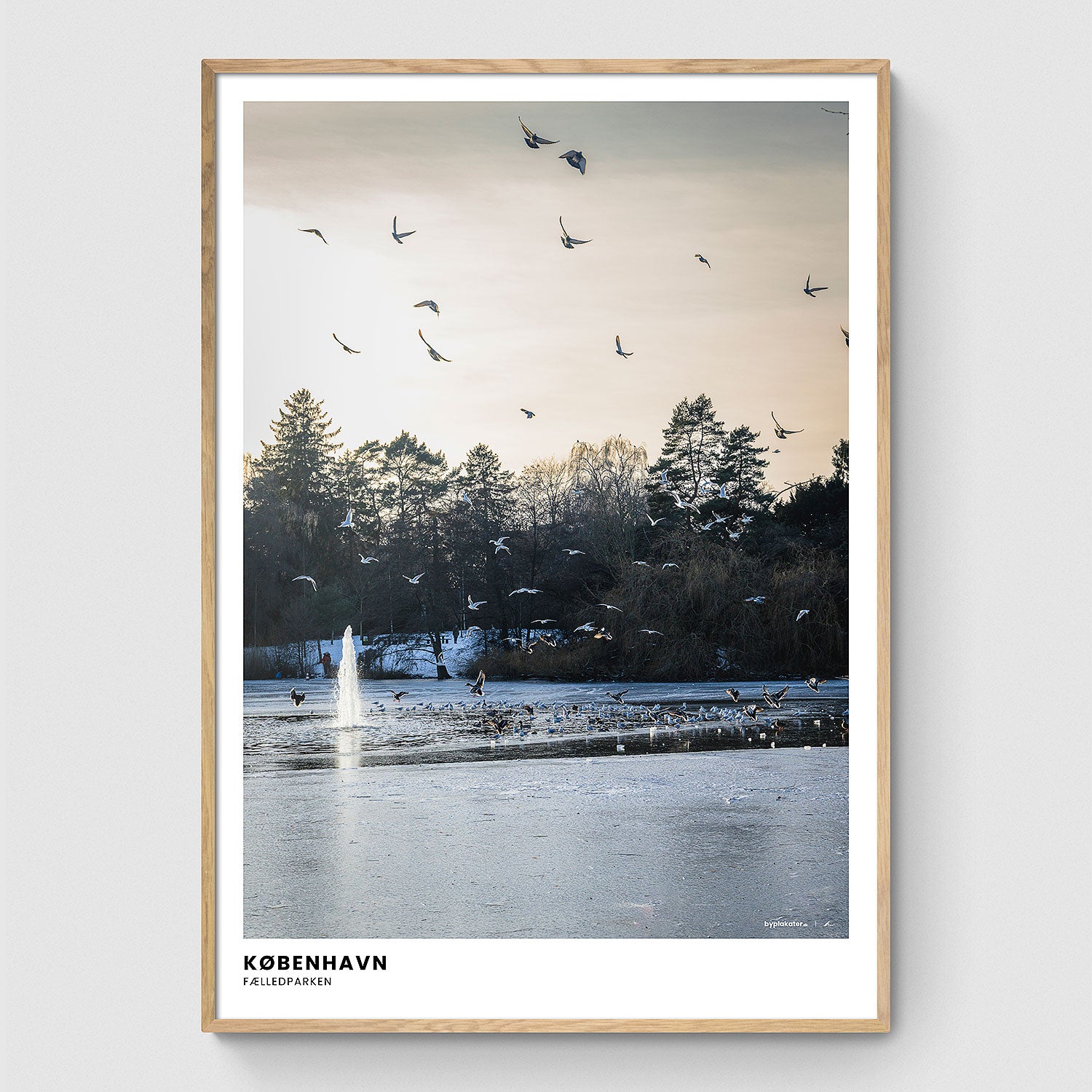 Denne plakat indfanger en rolig vinterdag i Fælledparken, hvor søen ligger stille, springvandet bryder overfladen, og fugle flyver lavt hen over vandet. De kølige nuancer og den åbne himmel skaber et balanceret motiv, der emmer af stilhed midt i byen.